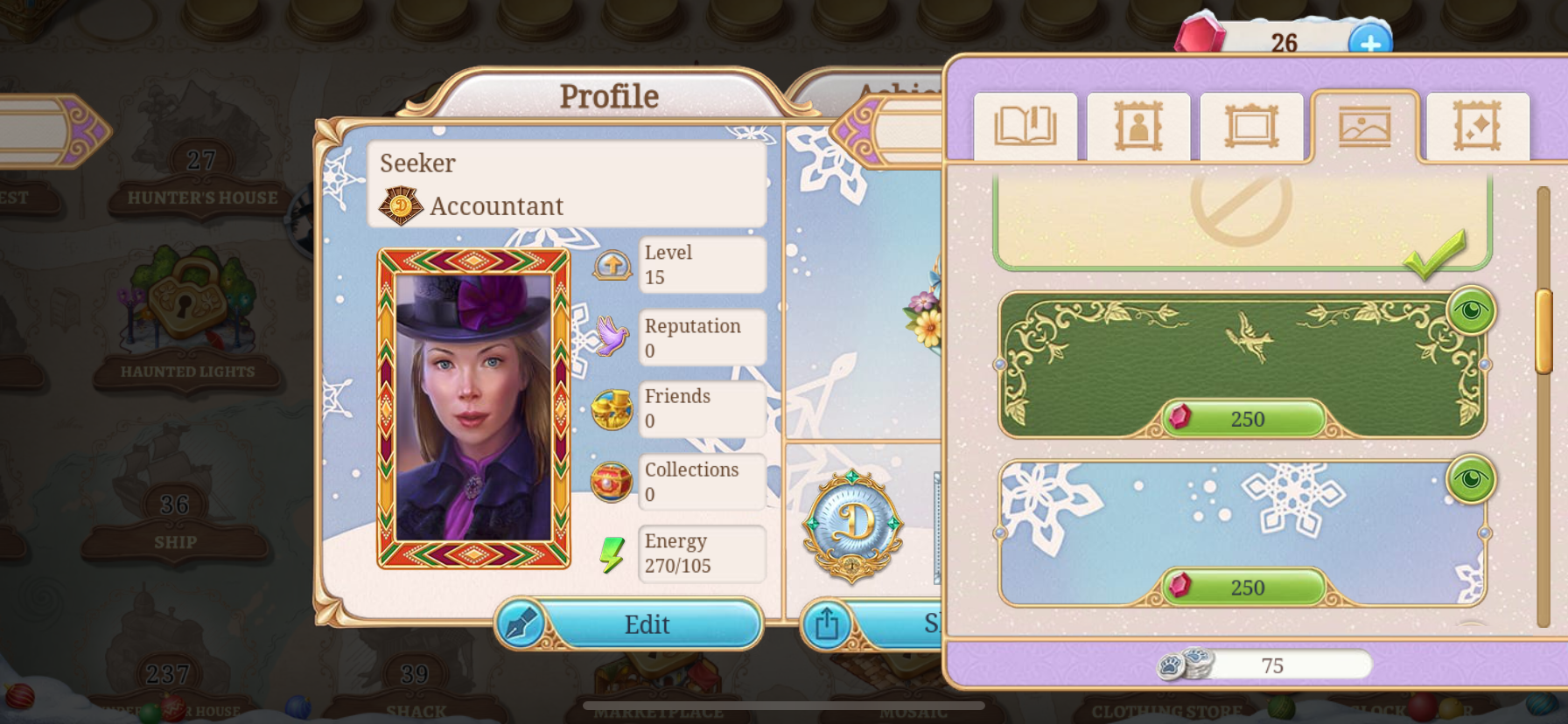 Auf der vierten Registerkarte kannst du einen Hintergrund für dein Profilfenster auswählen. Du kannst neue Hintergründe für Silberpfoten kaufen – du erhältst sie, wenn du an Events teilnimmst oder die Hauptevent-Orte durchsuchst.