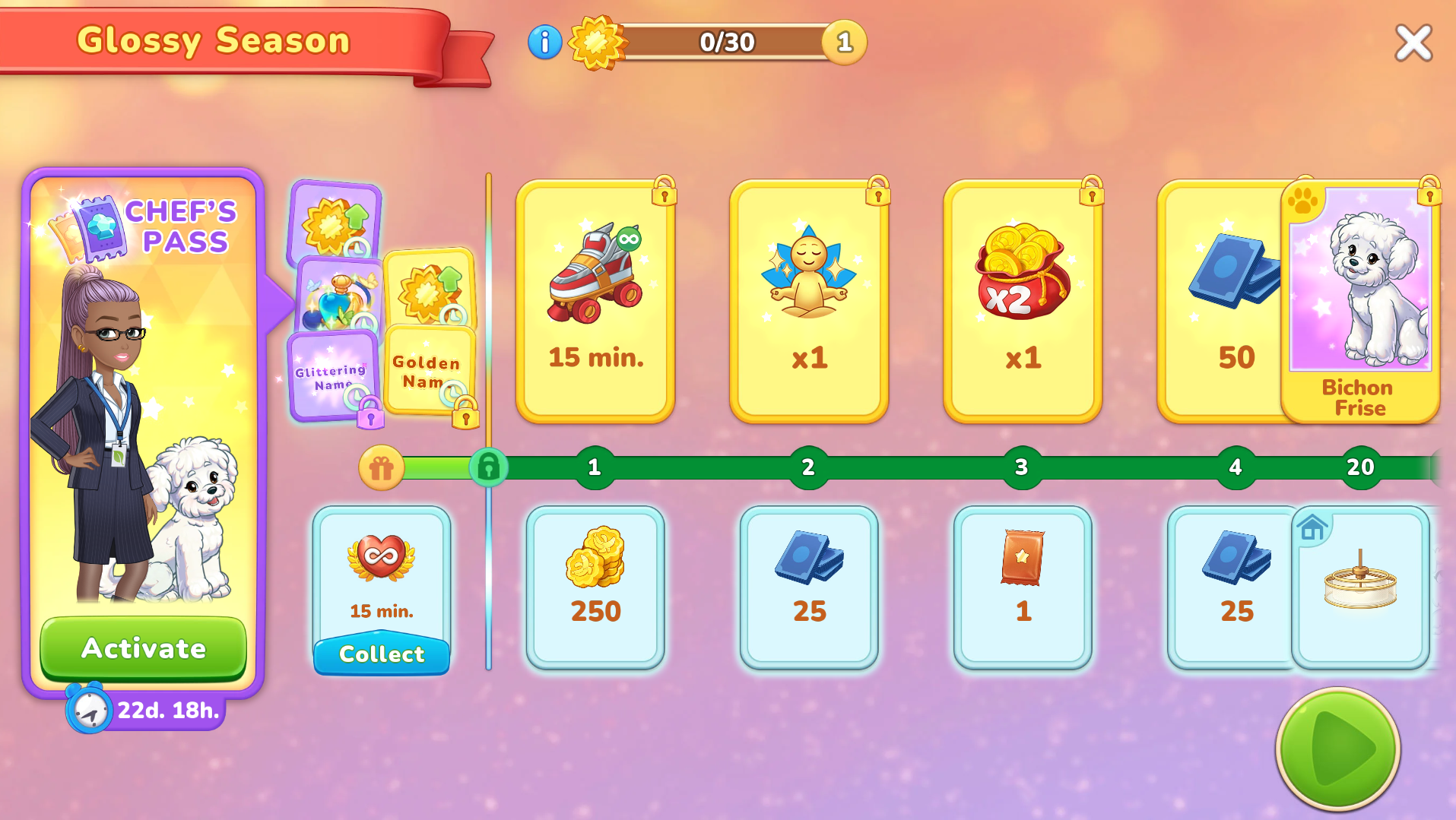 ¡Atención! El nombre brilloso y otras bonificaciones solo están activos durante el evento Pase de chef en curso.